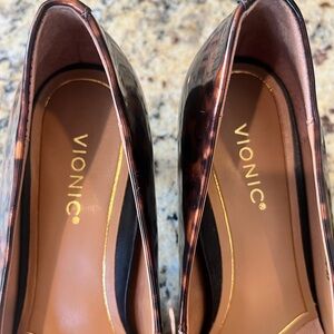 Vionic Womens Kitten Heel Josie Pointed Toe Brown Black Patent Animal Size 7.5