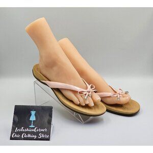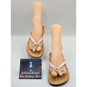 These elegant Vionic flip flops chic light pink strap adorned with a delicate bow. The brown sole ensures grip and durability, while the ergonomic design prioritizes comfort. Perfect for casual outings or leisurely strolls, these sandals promise both style and functionality for women.