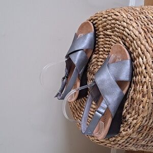 Trending comfort brand Vionic women's metallic silver slingback wedge sandals with 2.5" heels, adjustable ankle strap and orthopedic designed padded footbed. Pre-owned and in very gently used condition. Please see pictures.
