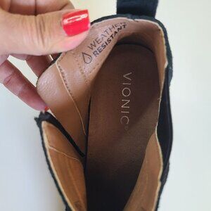 These Vionic ankle booties offer a sleek look with their black suede finish and wedge heel, providing both style and comfort for everyday wear. I wore them once only, they are in excellent condition, and come from a smoke free, pet free home.