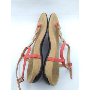 Vionic Womens Lizbeth Leather Coral orange tone with brass tone Coin detail T Strap Thong Shoes sandals. There is no size tag but it measures as size 9. For accuracy, you can compare measurements with your own shoes and per vionic measurements 10" foot equals size 9. Pre owned good condition with some minor wear including strap side glue come off a little, scuff marks on bottom of shoe and some of shoe and also slight wear mark noted on one of the coin. For more details please study all pictures.