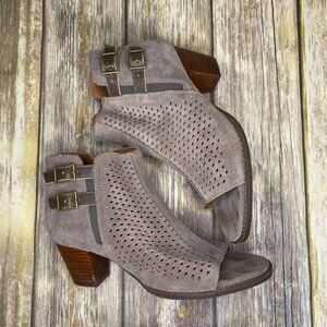 Vionic Women's Size 7.5 Chryssa Taupe Suede Peep Toe Cone Heel Ankle Booties