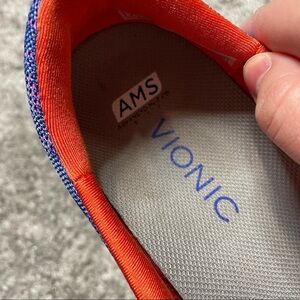Women’s size 9 purple orange and white leopard animal print slip on active wear shoes by the brand the vionic. Orthotic Mesh Slip-on Sneakers, Agile Hydra. Good condition with light wear, small mark on white area, as pictured