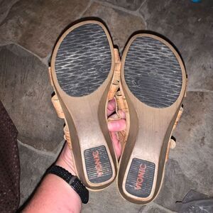 Vionic strappy, arch support, ortho, tan, wedge sandals. Pairs well with a dress or blouse and shorts. In good, used condition. From a pet and smoke free house. Happy to bundle!