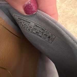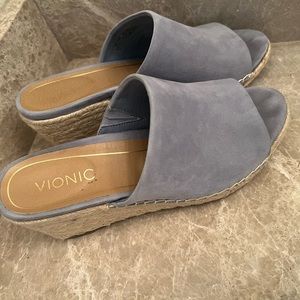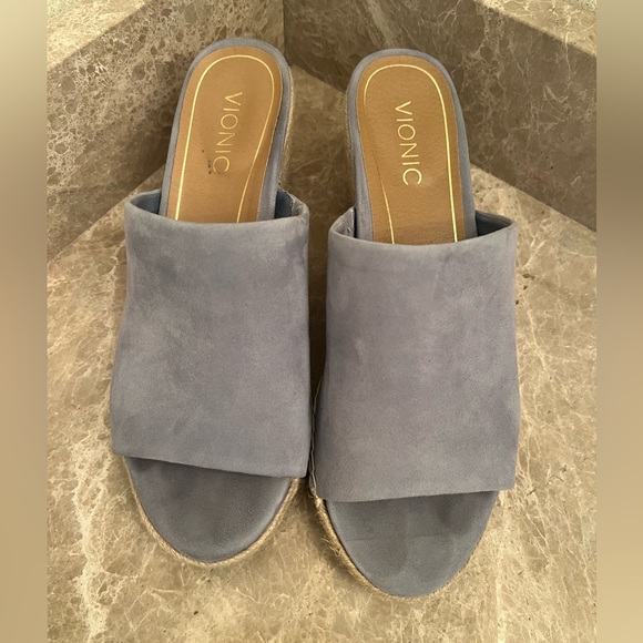 These are great shoes, but after some foot trouble I cannot wear them. They have only been worn two times. They are a light blue velvet outer with a jute wrapped heel.