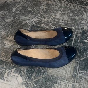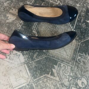 Chic navy flats with glossy navy toe cap. Comfortable and stylish for everyday wear.