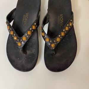 Experience the perfect blend of comfort and elegance with Vionic's black and gold sandals, featuring a stylish studded design on the straps. These sandals offer a supportive footbed and a chic look, ideal for casual summer outings.