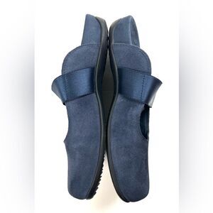 Gently worn Vionic blue mules. Stylish navy blue slip-on shoes with a comfortable design. Blue suede with a stretchy elastic strap for added comfort.