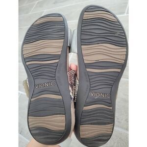 Vionic Camila Double Strap Slide Sandal. Snake print and solid straps. Adjustable velcro. Good pre-owned condition. Some minor wear, with lots of life left. Size 7.