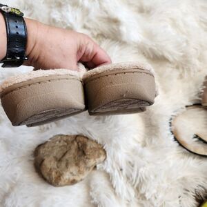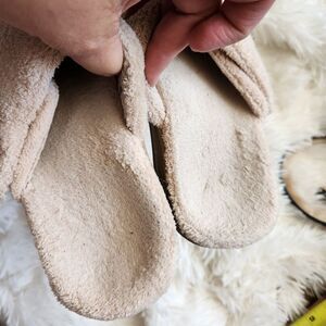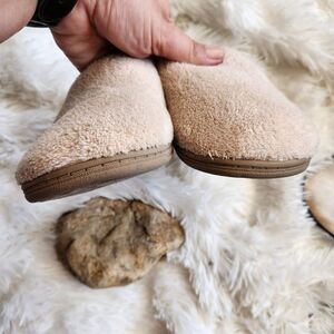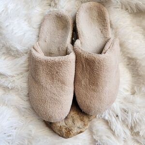 plush spa style slipper shoe with orthotic insole arch support. has some wear spots where the plush lining is pushed down. doesn't affect wear. all areas of wear have been shown. color is a tan/ cream. could even be worn as a shoe