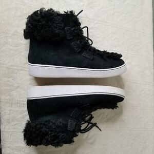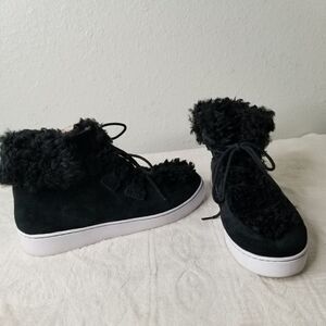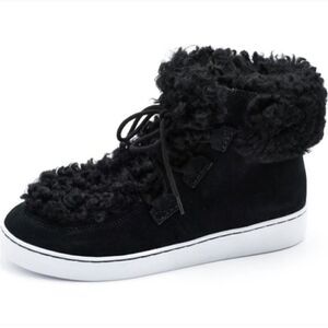 Ankle hi-top sneaker silhouette with a faux-fur Sherpa collar and tongue.