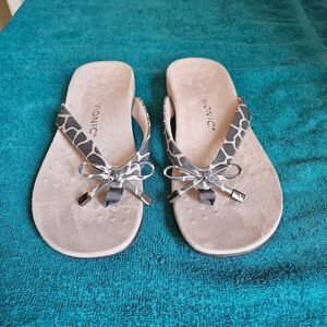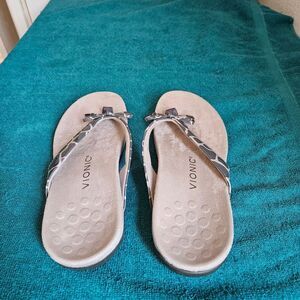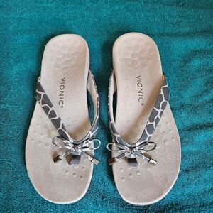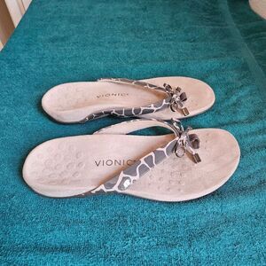 Animal pribt Vionic Bella flip-flop, designed with a focus on comfort and support, featuring a biomechanically designed footbed to help with alignment and reduce stress on the feet, ankles and knees. The upper part of the flip-flop is made of manmade material, and it includes a decorative bow. The footbed is covered in microfiber, and the sole is made of durable rubber with a patterned tread for traction. known for being lightweight and suitable for all day long.