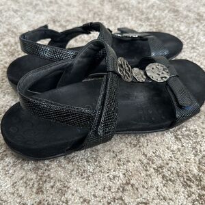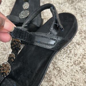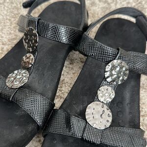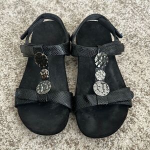 Black sandals with 3 disc detail and Velcro closure. VGUC