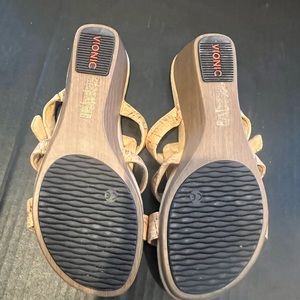 Vionics sandal, tan straps with gold accents and cork heels. Size 8, great condition, very comfortable, nonsmoking home. Vionics are good for your feet and good for your pocketbook.