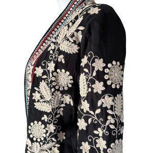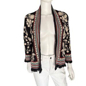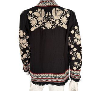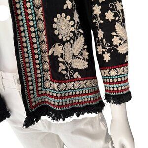 This open-front jacket showcases intricate hand-embroidered floral designs in ivory threadwork, accented with vibrant multicolor trims and fringe detailing. Crafted from a soft, lightweight fabric, it blends artisanal charm with modern style, making it a statement piece for layering and elevating any sophisticated outfit.