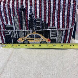 1 beaded NYC Taxi Cab shoulder bag that features NYC graphics in the front and vertical red white and navy blue stripes on the back