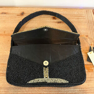 The bag closes with a magnetic snap and has a medium size making it perfect for travel, parties, or casual outings. The beaded design adds a touch of sophistication, and the limited edition piece comes with an included pouch and silver lining.