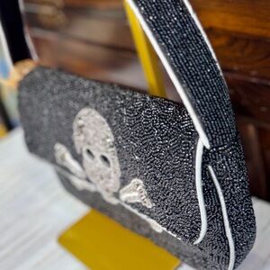 Turn heads with this edgy beaded skull & crossbones shoulder bag – a must-have for lovers of gothic, rocker, or punk style. Hand-beaded design with shimmering black seed beads and silver skull detail makes this bag a statement accessory perfect for concerts, nights out, or adding attitude to any outfit.