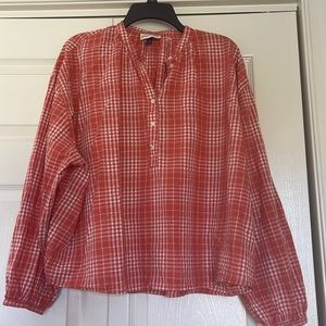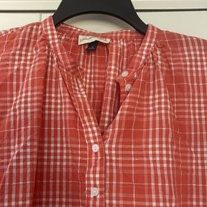 Excellent condition, half button down, cotton - rayon mix, 29” pit to pit, 24” long from top center in back to bottom in back.