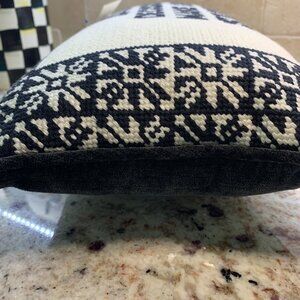So fun to have on the couch, a chair, or the bed. Cute pillow that is hooked in front and velvet in back. Size is 14.5" x 8.5" x 4". So cute, and easy to mix with your other pillows. Black and white with solid black background.