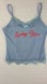 Powder Blue Lacy Cami with red text printed: “Lucky You”