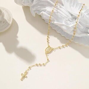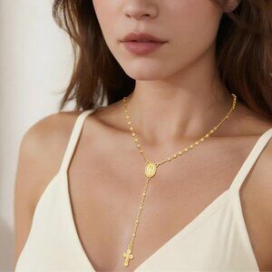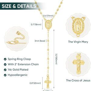 Features: This beautiful rosary bead necklace features a 14K gold-plated Y-chain with a cross pendant, designed with deep spiritual significance. The lobster clasp and 2-inch extender offer versatile fit, perfect for everyday wear or special religious occasions.