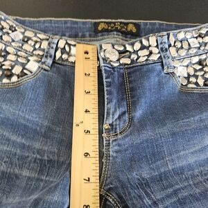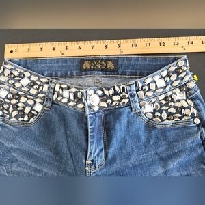 Description: Virgin Only Dark Wash Distressed Low Rise Bejeweled Jeans size 28