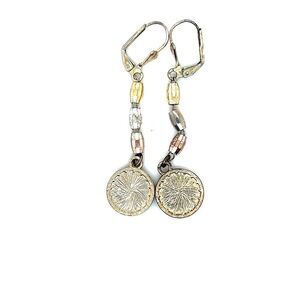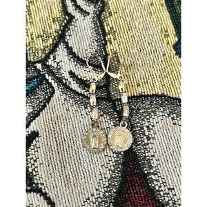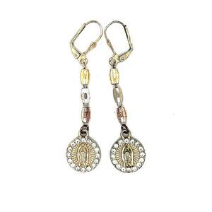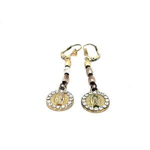 Virgin Mary Dangle Earrings Earrings shows wear and discoloration Needs cleaning Tricolor beads