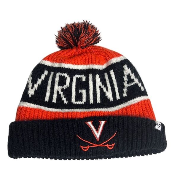 This '47 brand beanie is an official Virginia Cavaliers merchandise, featuring an embroidered Cavaliers logo and a multicolor pom. Designed for unisex adults, it comes in a one-size-fits-all and is made from knit material. The beanie is perfect for casual occasions, especially during the winter season. It is themed around sports and basketball, specifically UVA Basketball. The beanie is pre-owned.