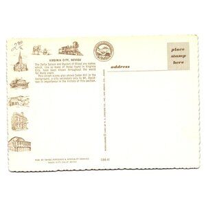 Classic postcard featuring Virginia City Nevada, showcasing the historic Delta Saloon and Cedar Hill. Published by Tahoe Postcard, the unused card is a collectible piece of Americana.