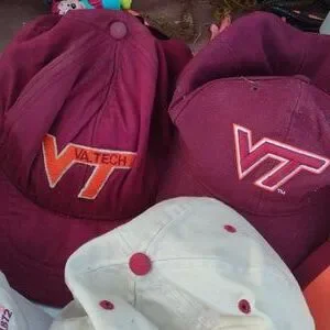 Set of Virginia Tech caps in maroon, orange, and white. Perfect for fans.