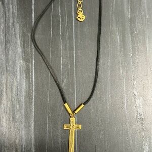 Never worn- new condition. Cross is on an adjustable leather chain, details are plated over bronze.