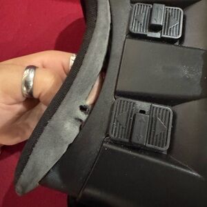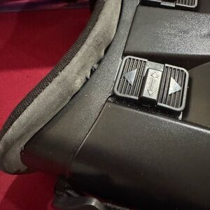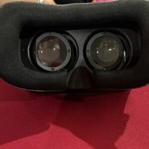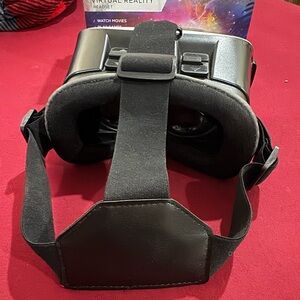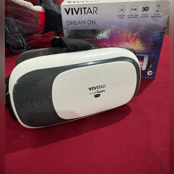 virtual reality headset in white and black. Comfortable adjustable straps for extended use. Lightweight design with soft face padding for a secure fit. Compatible with most smartphones for immersive VR experiences. It comes of from one side if pulled but stays on when headset is on. It was used a few times by my kids. Instructions are inside box