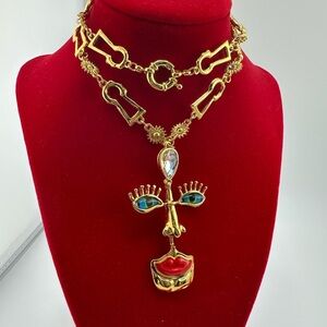 This stunning gold necklace features an artistic face pendant with colorful accents. Perfect for adding a unique touch to any outfit.