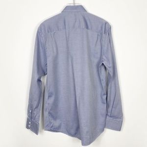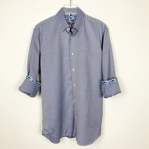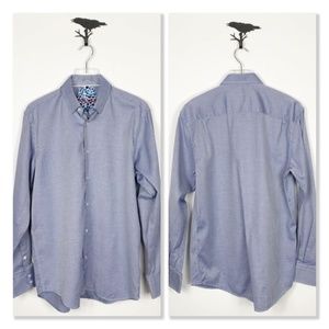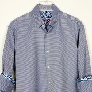 Visconti Black blue & white long sleeve button down shirt. Geometric pattern. Hidden button down collar. 2 button mitered cuff. Floral pattern on inside of cuffs. Back side pleats. In excellent condition.