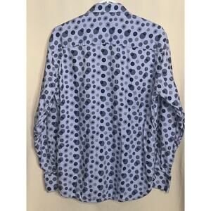 This Visconti Black 100% cotton men’s button-up shirt in size Medium features a bold blue base with an allover polka dot and circular motif. Known for high-quality tailoring and standout prints, Visconti Black creates modern fashion staples that transition easily from casual to dressy. This shirt’s breathable cotton fabric and stylish design make it perfect for nights out, office-casual looks, or adding a fashionable edge to your wardrobe.