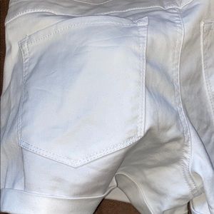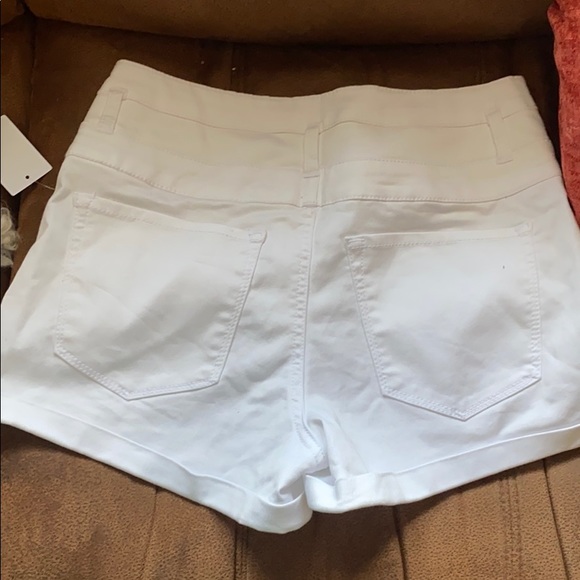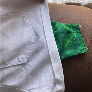 The green fabric (in the last photo) is used to show what it looks like with colors underneath. Personally, I feel that it does not show through very much. They are very opaque for being white shorts. I do not tend to try wearing colors that either match my skin tone or have a similar paleness to my skin underneath white (no matter the opaqueness). However, these seem like they will do well with most colors.
