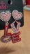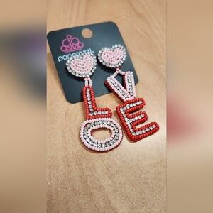 Featuring a border of white rhinestones, baby pink seed beads are embellished along a red felt heart frame giving way to red and baby pink seed bead bordered letters that spell out the word "LOVE." An additional row of white rhinestones is embellished along the center of each letter for a heartfelt glitzy finish. Earring attaches to a standard post fitting.
