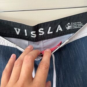 Like new pair of swim trunks/board shorts from the brand Vissla in a size 32. These shorts are a mix of red, white and blue. Tie closure at the waist with a pocket on the back. No stains or flaws!