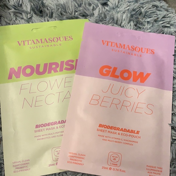 Glow Juicy Berries and Nourish Flower Nectar biodegradable masks.