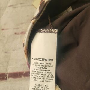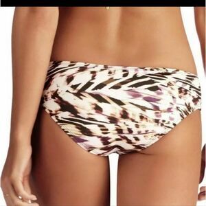 Cream, plum, and brown print with braided straps on the top and bottom. Lightly padded cups.