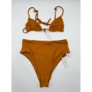 Adjustable triangle bikini top and high cut high waisted bottom. Burnt Orange.