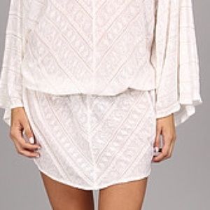 Vitamin A light and sheer drop-waist caftan Tunic is perfect to cover up with before taking a dip. Fine crochet Knit, plunging neckline, batwing sleeves, and loose, trapeze silhouette. Adjustable drawstring at the hips for a custom fit, floaty thigh-high hem. Layer it over your bikini. Y day, add statement jewelry and sandals for cocktail hour. Cotton, Viscose, polyester, and nylon. Made in the USA. Hand wash cold water. NWT