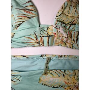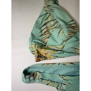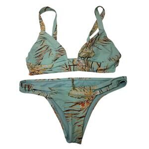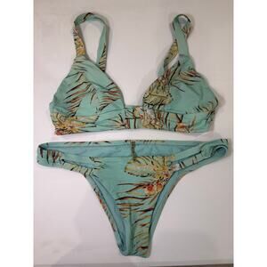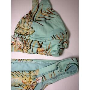 Turn heads this summer with this stunning Vitamin A bikini set in size L! Gently used and in excellent condition, this tropical print bikini features a soft mint green base with vibrant palm and floral accents. The top has flattering triangle cups with supportive wide straps, while the bottom brings a sexy touch with its double-strap sides and cheeky cut. Perfect for beach days, poolside lounging, or tropical getaways!