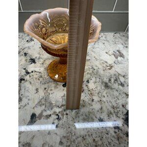 This Fenton glass compote exudes vintage charm with its amber opalescent hue and intricate Cameo Eye & Scroll design, ideal for decor or serving.