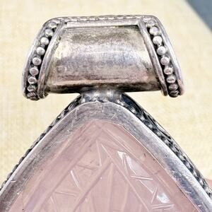 Vintage Large Teardrop Carved Rose Quartz Sterling Silver Pendant is over 3 Inches long and 2 1/8" wide. Approx. 23" thick. This piece is carved on both sides. The silver is not marked but it acid tests positive for 925 sterling silver. This is a hefty piece and weighs 170 grams.