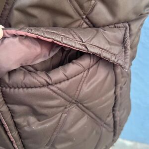 Vintage puffer quilted nylon fishing vest in brown. No size tag but fits like a mens medium. Nylon with polyester filling. In great shape with one mark. By Baileys Sportswear.
