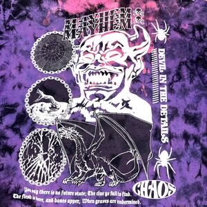–Large back graphic: ‘MAYHEM’ stacked lettering, devil face, dragon, spider web, chaos motifs