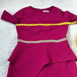 Magenta dress in a sheath silhouette with pointed peplum and attached rhinestone waistband. Back zip closure and short sleeves, with slit in rear of skirt. Dress has a bit of stretch, no pockets. Styled in Italy - Italian 42 is USA size small.
