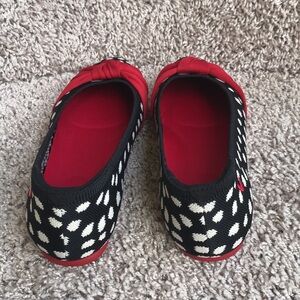 Chic and stylish polka dot ballet flats featuring a bold red bow knot. Perfect for adding a playful touch to any outfit.